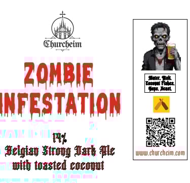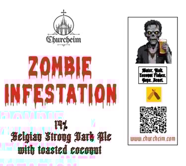 A monstrous Belgian Strong Ale born of shadow and sugar. Deep, complex waves of coconut and syrup from the Philippines crash into layers of dark fruit—prunes, figs, and plums—while Norwegian malt and house-made malt syrup form its brooding backbone. Hints of licorice and roasted malt rise like whispers from the grave, chased by haunting echoes of dark berries and a warming, boozy finish. Inspired by tropical zombie horror, this 14% beast balances the exotic with the macabre—sweetness veiled in smoke, richness wrapped in ruin. It’s not just a beer. It’s the last taste before the end.